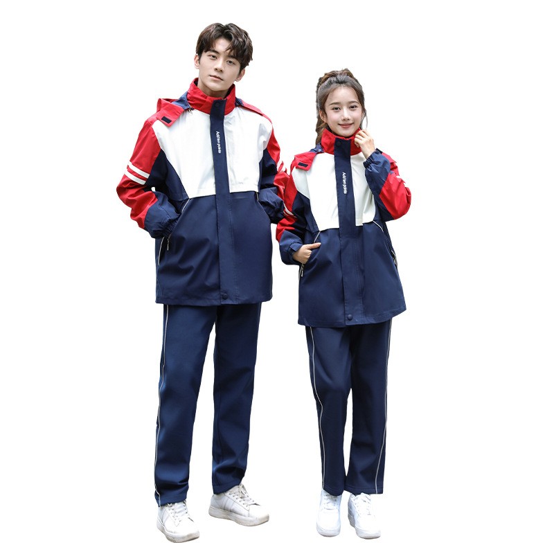 This functional uniform set combines practical outdoor design with vibrant color blocking to create the perfect solution for changing weather conditions. The hooded jacket and coordinated pants provide complete protection and comfort for students from kindergarten through high school.