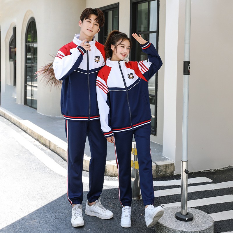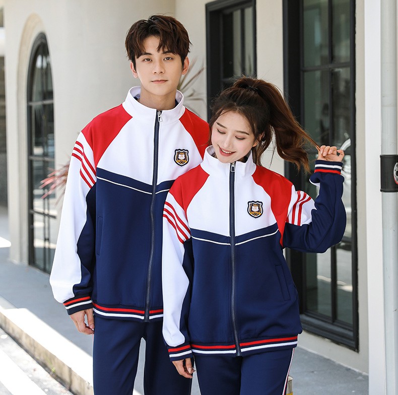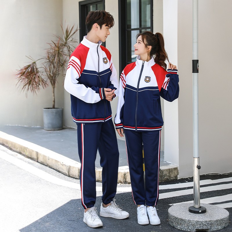 This vibrant athletic set combines functional design with bold color blocking to create the perfect uniform for transitional weather. The stand-collar jacket and tapered pants work together to provide both style and mobility for various school activities.