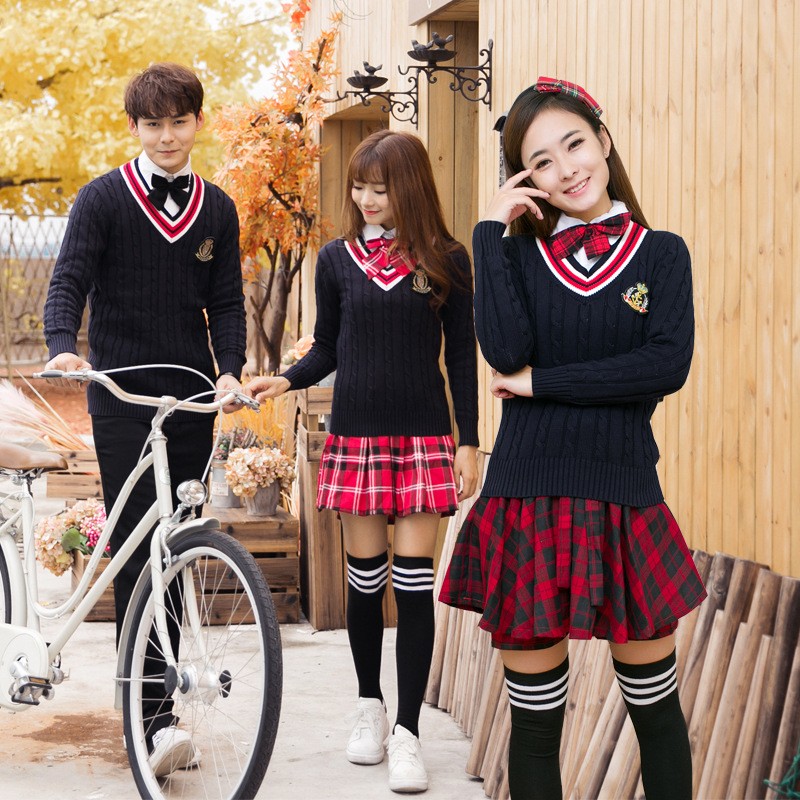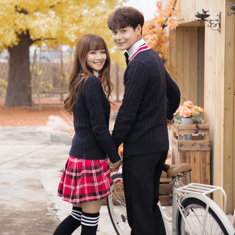This elegant knitwear set brings together traditional cable knitting and contemporary school style. The contrast trim on the V-neck sweater adds a sharp finish, while the plaid skirt and knee-high socks create a cohesive, vibrant look perfect for building a positive school identity.