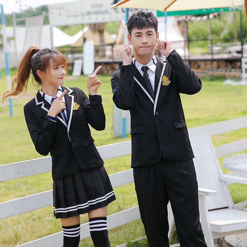 This sophisticated uniform collection reimagines classic British style with contemporary flair. The striking white piping on the black blazer creates a sharp, defined silhouette, while the subtle striped shirt adds depth to the overall aesthetic, perfectly balancing formal requirements with youthful energy.