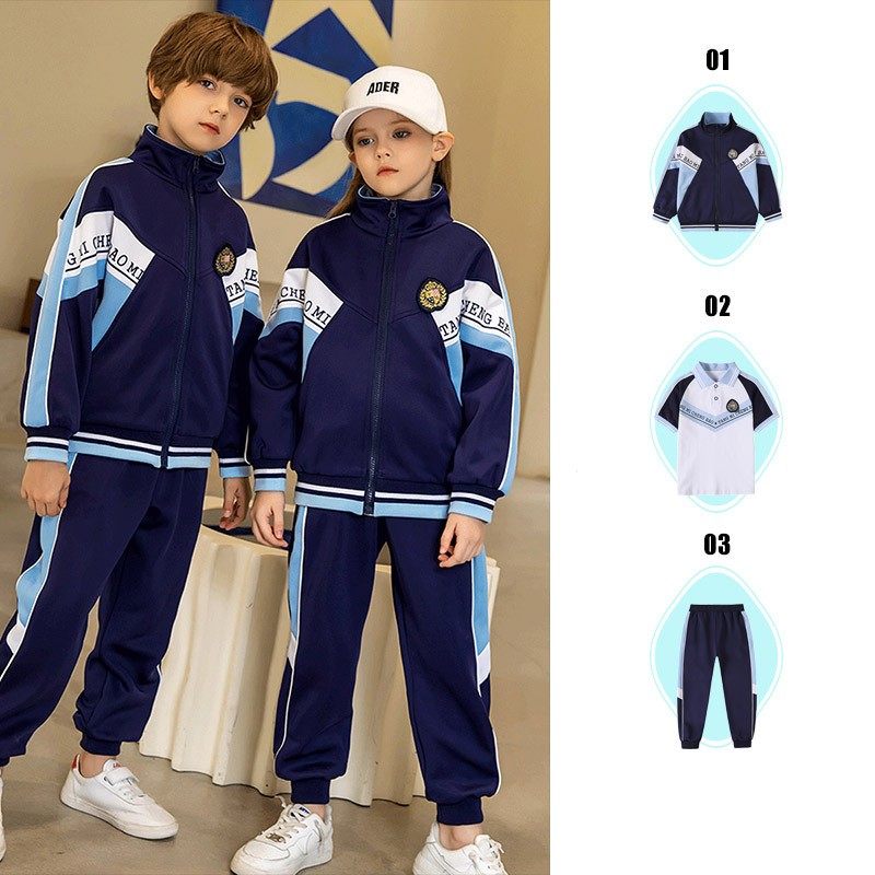This coordinated sportswear collection features a sophisticated blue color palette that creates visual harmony across all pieces. The set offers practical solutions for different seasons while maintaining a unified athletic aesthetic perfect for various school activities.