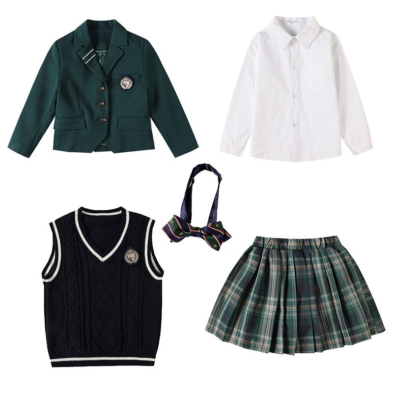 This elegant school collection features a sophisticated forest green color scheme with coordinated plaid elements, offering versatile styling options suitable for various school occasions while maintaining a consistent professional image.
