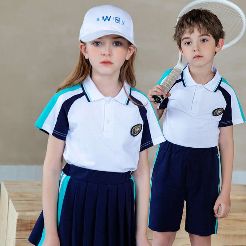 Gender-Specific Styling: Boys' and girls' sets share the same polo shirt design while distinguished through tailored shorts (boys) and pleated skirts (girls) with matching teal side stripes