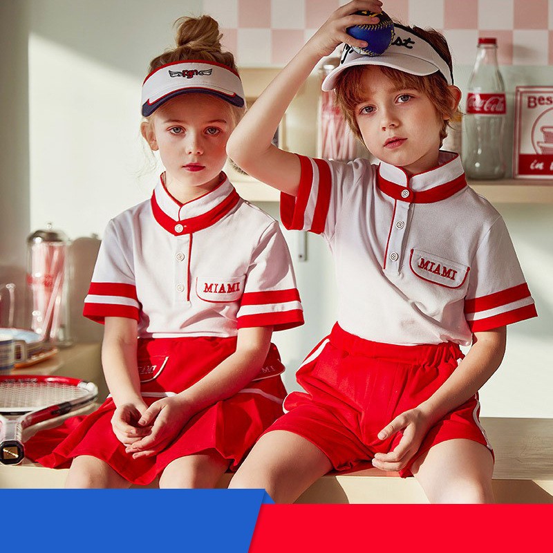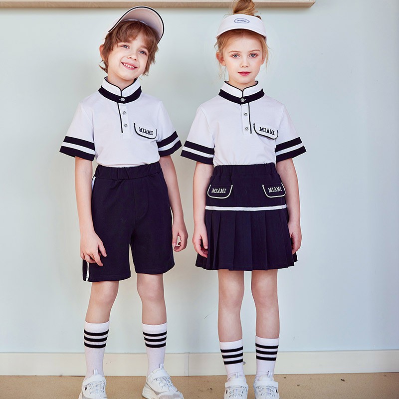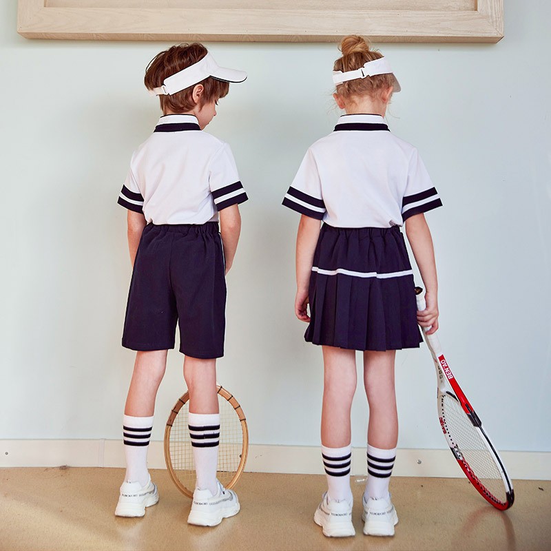 All students wear the same collar-style shirts, while differentiated through tailored shorts (boys) and pleated skirts (girls) with matching color schemes