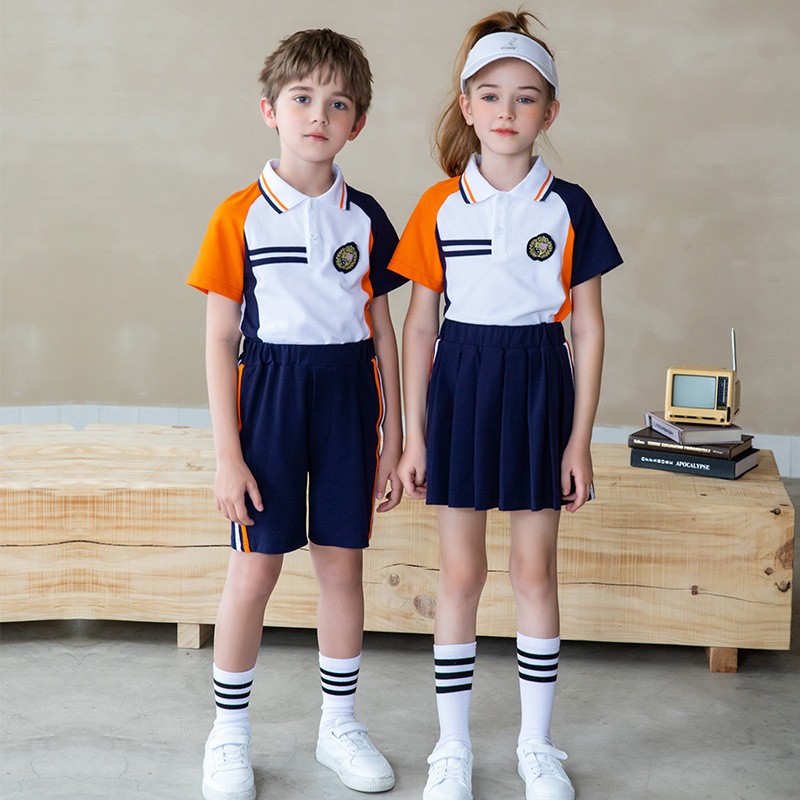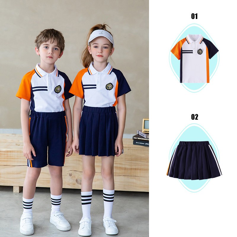 Gender-Adaptive Design: All students wear the same polo shirt with school badge, while boys feature orange-white striped shorts and girls wear navy pleated skirts with white side accents