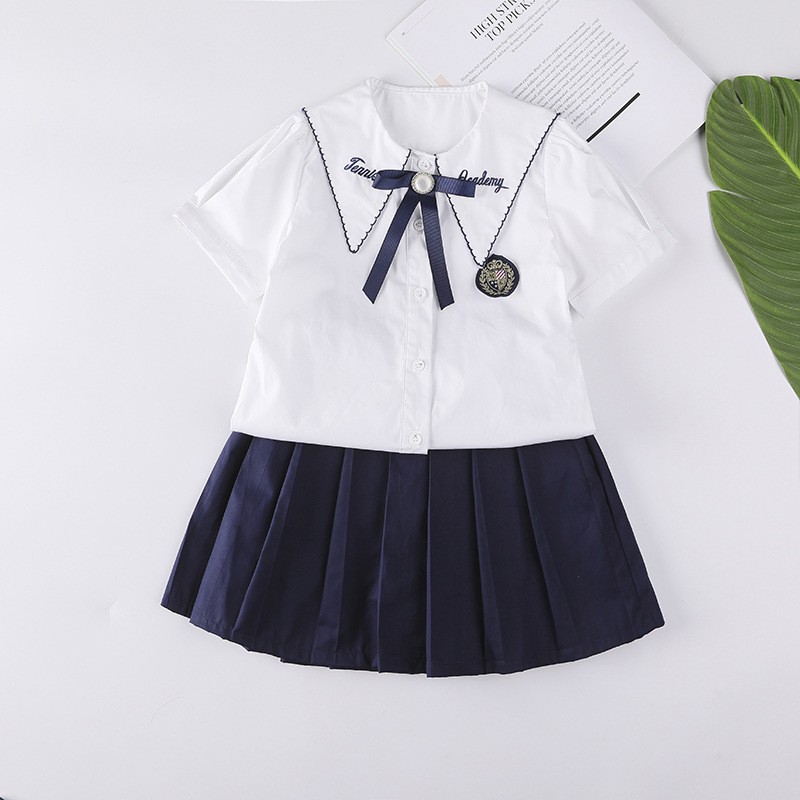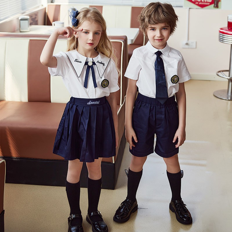 Crisp white shirts paired with deep navy bottoms establish a clean, unified campus image suitable for both daily wear and special occasions