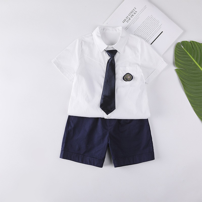 Boys: Traditional shirts with black neckties and school badge, matched with tailored shorts