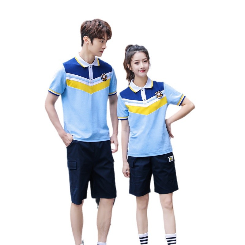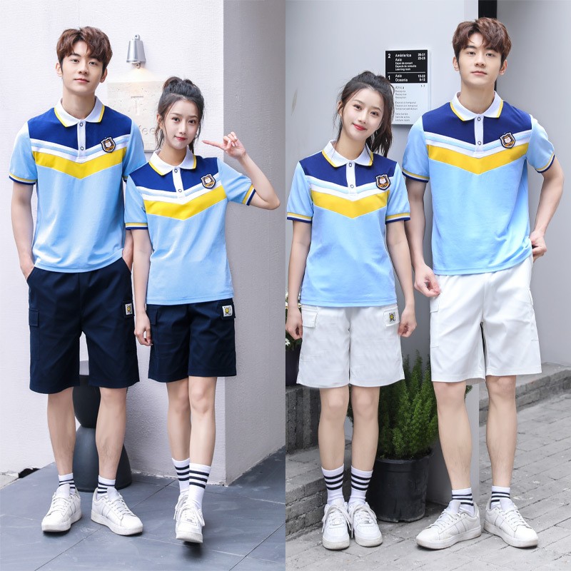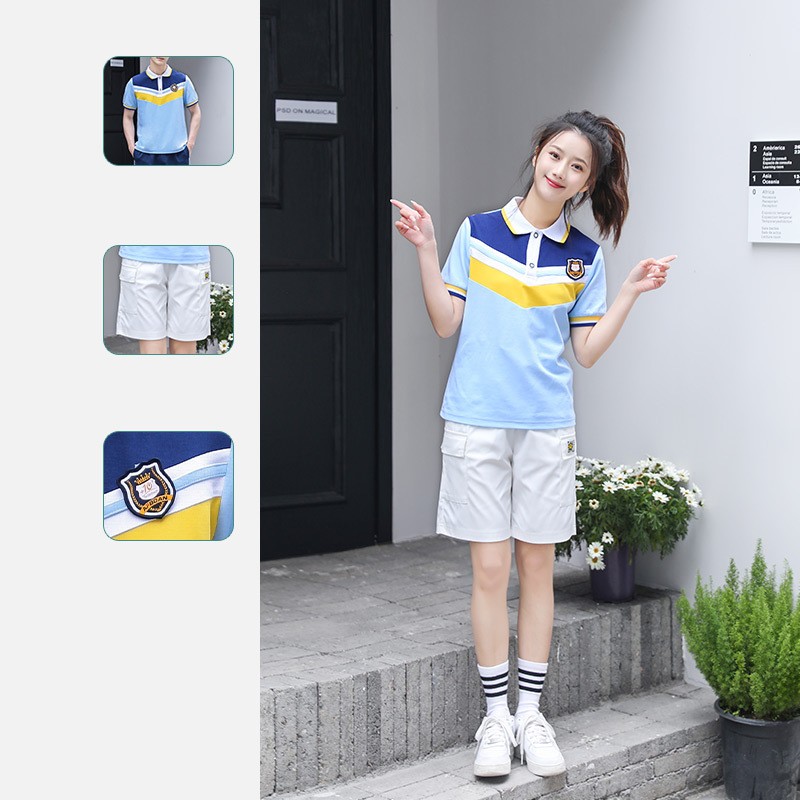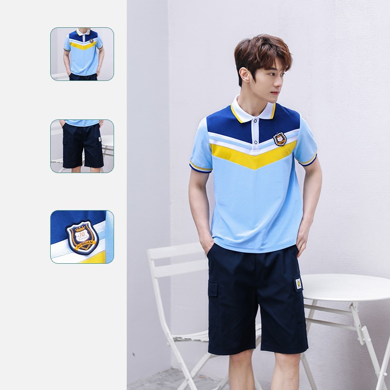 This dynamic two-piece set is designed to keep students cool, comfortable, and looking sharp during the warm academic months. The bold blue and yellow V-shape color blocking on the polo shirt creates a modern, energetic identity, while the choice of two short colors offers flexibility to match any school's style.