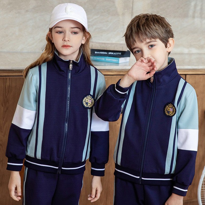 Modern Sporty Aesthetic: The stand collar jacket and color-blocking with white and light blue accents create a fresh, athletic look that appeals to contemporary students.