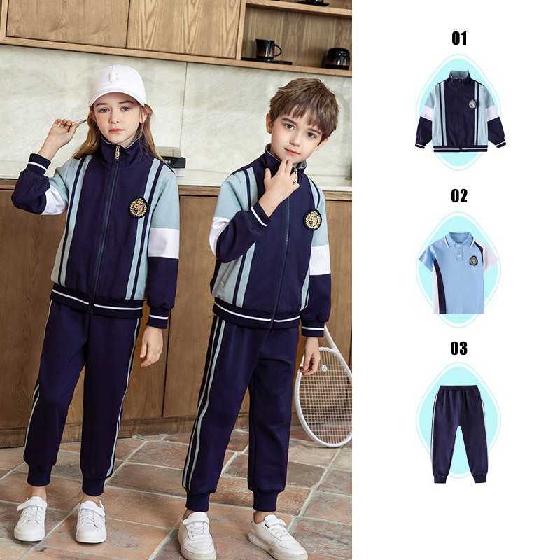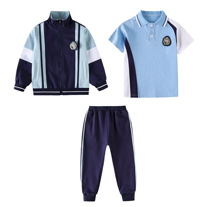This smart and functional three-piece set, featuring a stand collar zip-up jacket, a short-sleeve polo shirt, and coordinating trousers, is engineered for the changing temperatures of spring and autumn. The dynamic combination of navy blue, white, and light blue offers a modern, cohesive look for any school.
