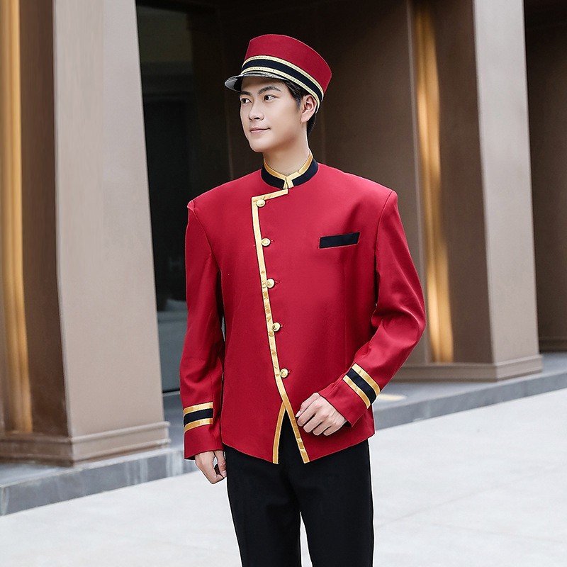 This distinguished bellman uniform features a striking red and gold color scheme, specifically designed to create an impressive first impression while ensuring comfort and mobility for entrance service professionals.