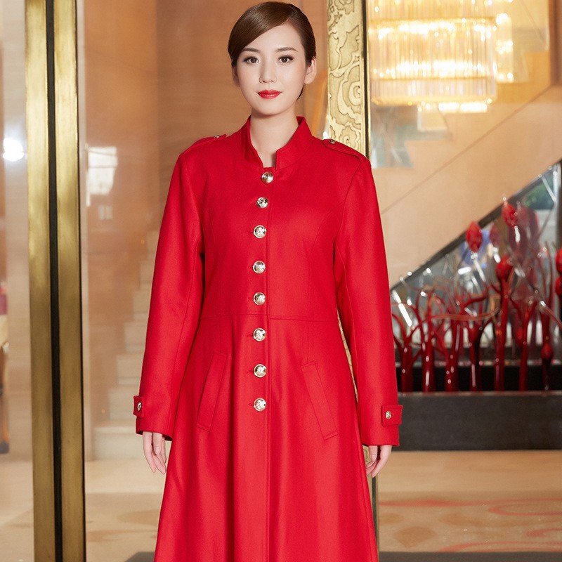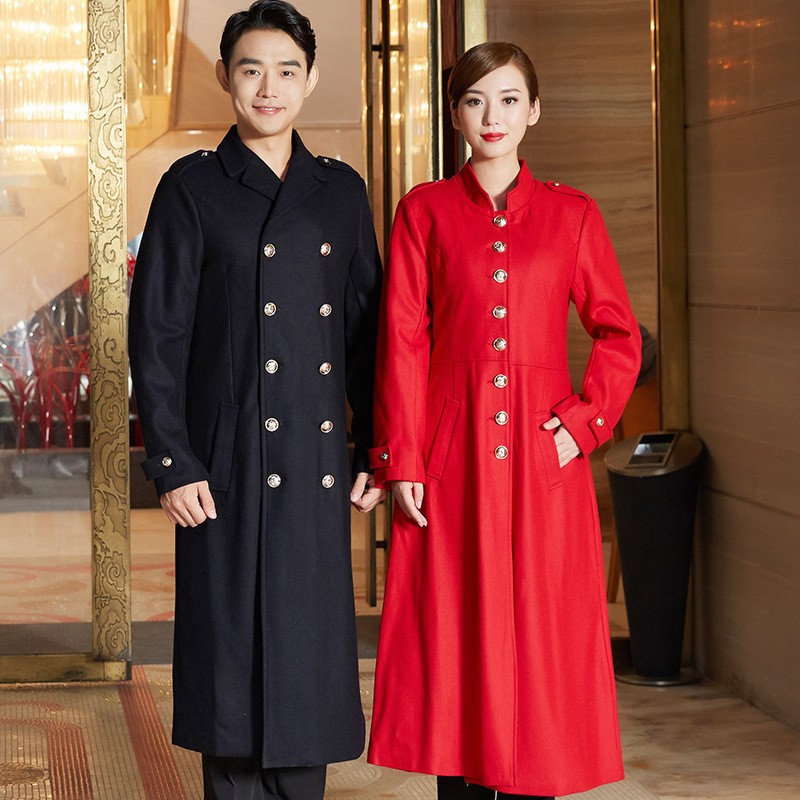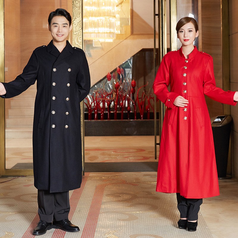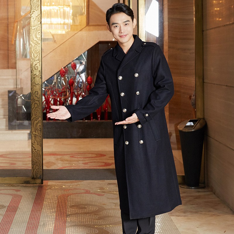 This sophisticated long coat collection combines ceremonial elegance with practical warmth, specifically designed for hotel entrance staff requiring both professional appearance and cold-weather protection during winter service periods.