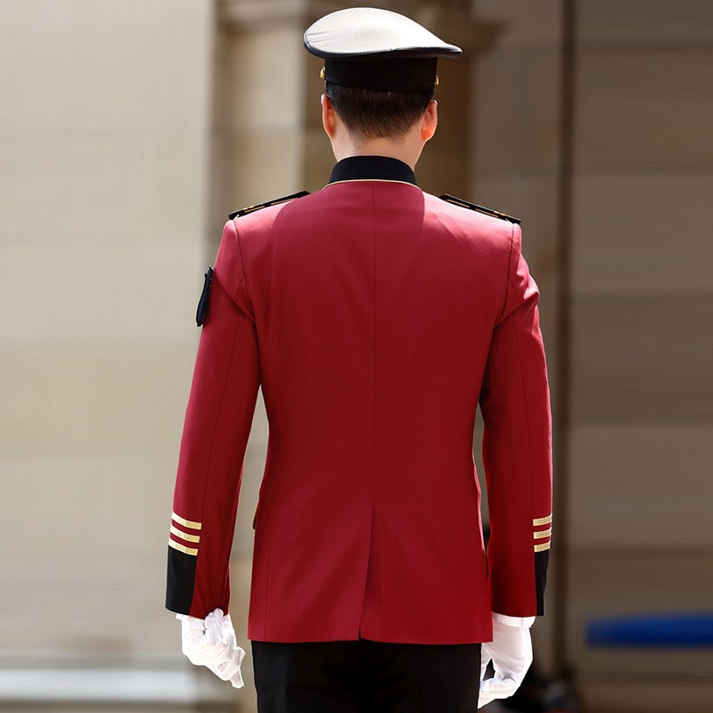 Red Version: Vibrant red base with gold buttons and black trim, designed for bellman positions