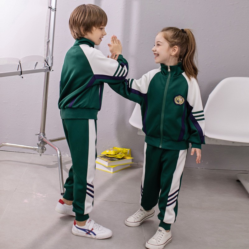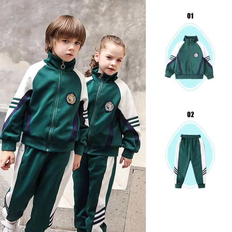 This sophisticated children's uniform set masterfully blends the crisp, formal appeal of British style with the comfort and freedom of modern sportswear. The deep green base, accented with classic white and navy blue stripes, creates a distinguished look suitable for both classroom learning and active play.