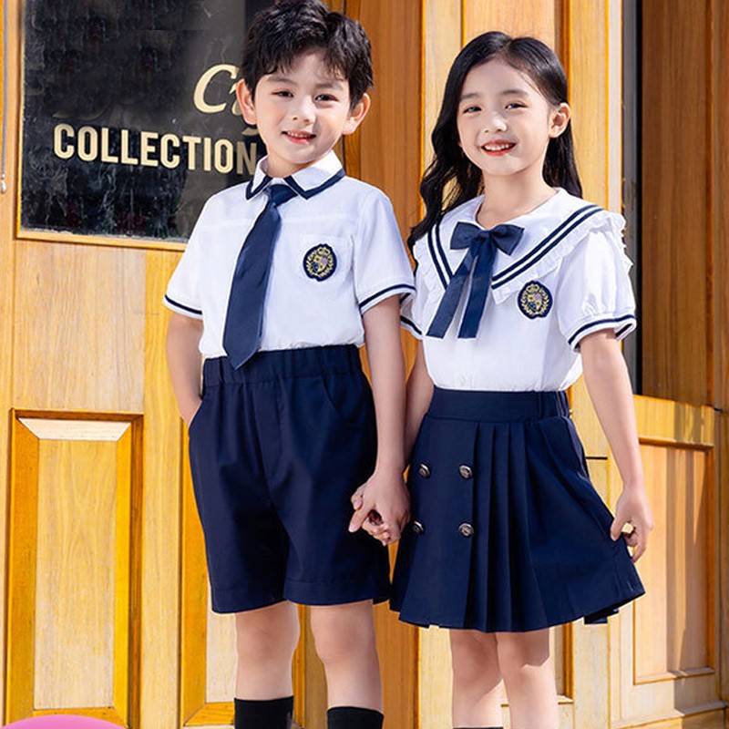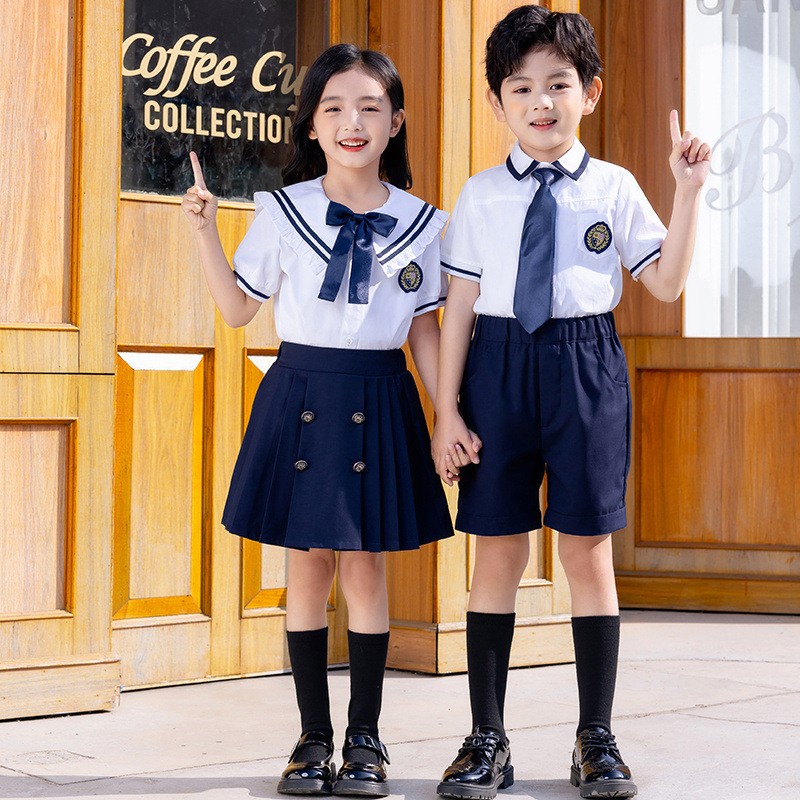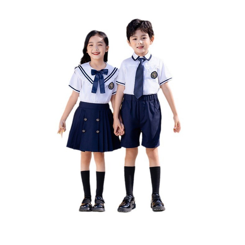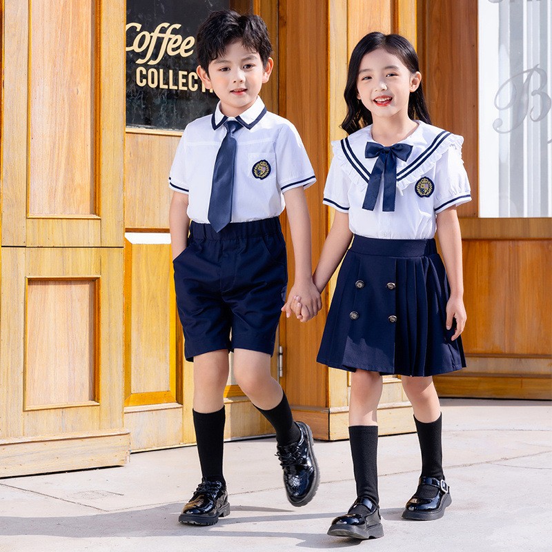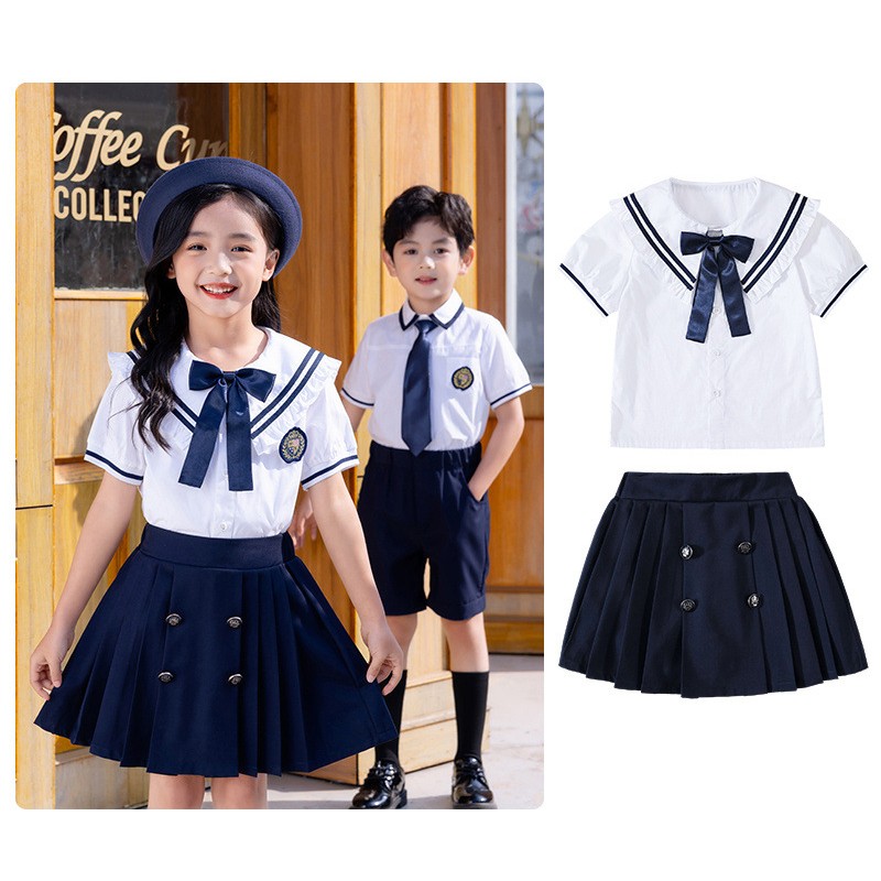 This elegant summer collection combines traditional nautical styling with lightweight comfort for warm weather wear. The crisp white and navy color scheme creates a fresh, professional appearance perfect for daily wear and special school occasions.