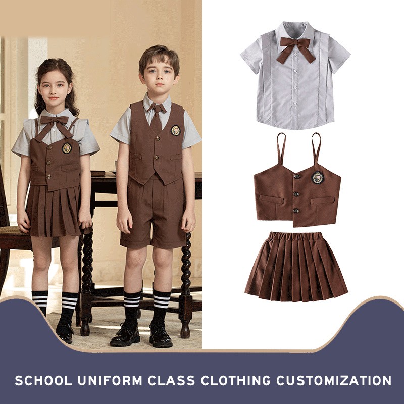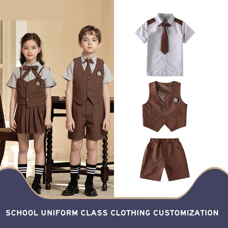 This sophisticated tan and gray collection redefines warm-weather formal wear with its elegant color combination and tailored silhouettes. The ensemble balances traditional academic aesthetics with contemporary comfort needs for prestigious school events.